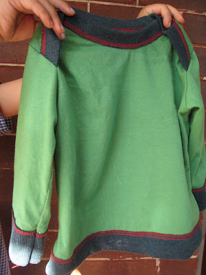 Anyway, the 90 minute shirt came together well and I got to use a few funky colours together. I generally avoid re-threading my overlocker (serger) whenever possible. Last time it to 40 precious kid-free minutes to get the next colour working right - arghh! So I left the red on, which I was happy with as a little detail.